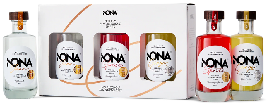 Ontdek de premium non-alcoholic spirits in de NONA Tasting Pack. Met deze voordeelbundel proef je de 3 NONA smaken, elk in een fles van 20cl. Laat je inspireren door ons receptenboekje boordevol verrassende alcoholvrije cocktails.